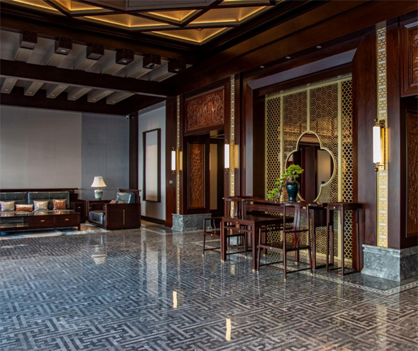 在李忠信藝術館的宋式門樓下駐足,飛檐翹角如鳥斯革,白墻黛瓦似水墨洇染。這座以現(xiàn)代中式歇山頂風格重構的建筑,將《營造法式》的精微比例與極簡美學相融合——門樓榫卯結構嚴絲合縫卻未用一釘,看似輕盈的懸山造型實則暗含力學智慧。設計師將紅木整裝工藝融入空間敘事:用木雕技法再現(xiàn)傳統(tǒng)匠作場景;中庭天窗采用榫卯結構的現(xiàn)代演繹,陽光透過鏤空花格在地面投射出流動的光影詩篇。