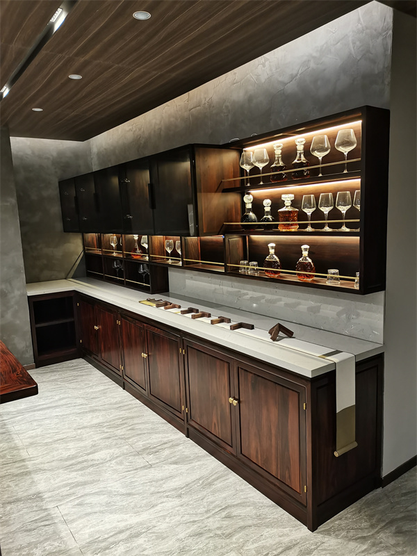 定制的紅木酒柜兼具實用性與觀賞性,大容量的設(shè)計可以容納各種美酒與藏品,而無柜門的運用則讓物品清晰可見,增添了空間的通透感。
