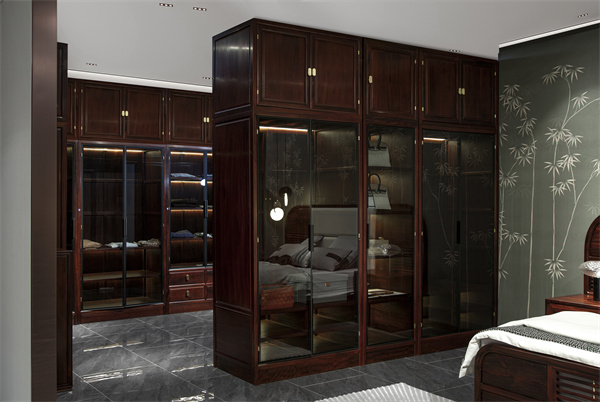 大容量的紅木與玻璃展示的新式頂柜是臥室的一大特色,頂柜采用紅木框架,搭配玻璃門板,既可以儲存衣物、被褥等物品,又可以展示主人的私人藏品。