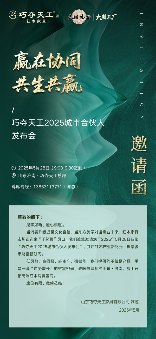 值此文化自信與商業(yè)變革交織的新紀元,巧奪天工紅木誠邀您于5月28日共聚齊魯大地,共啟“2025城市合伙人發(fā)布會”華章——以“贏在協(xié)同,共生共贏”為盟,共繪紅木產(chǎn)業(yè)財富藍圖,執(zhí)掌高端消費市場新航向!
