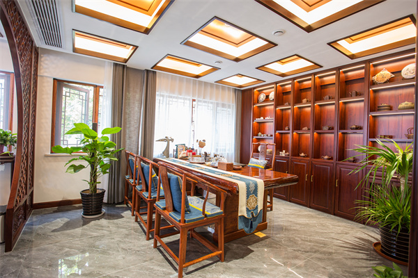 品茶,也是品木,品的是那一份超然自在的禪意。喝茶是一件詩意而又神圣的事情,茶與木皆出自然,均吸天地之精華,聚雨露之精髓,納萬象于一身。茶室內樸質素雅的桌椅擺設,精致的茶具,凸顯出典雅閑適的氣質。