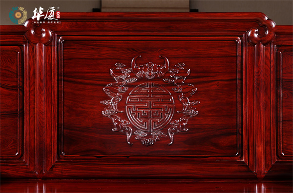 除了蝙蝠紋,華廈·大不同的紅木家具中還有許多與辟邪祈福相關的雕刻紋飾。