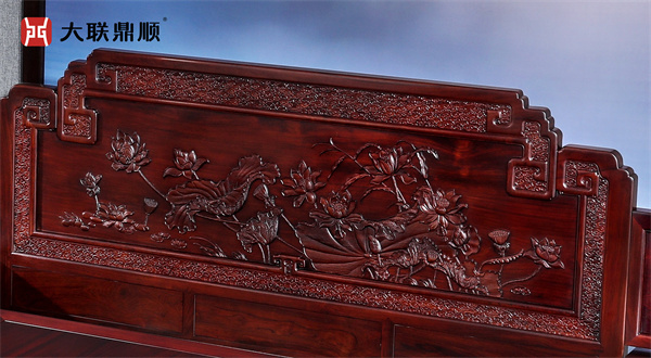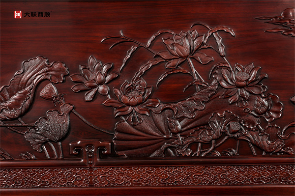 荷花紋:荷花“出淤泥而不染”,是純潔、清雅的化身。鼎順紅木常將其雕于座椅靠背、頂箱柜門、床榻圍板等,花瓣舒展,蓮葉田田,傳遞著主人高潔脫俗的情懷,為空間注入靜謐禪意。