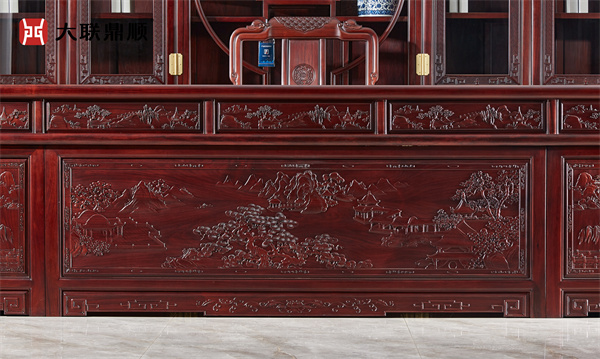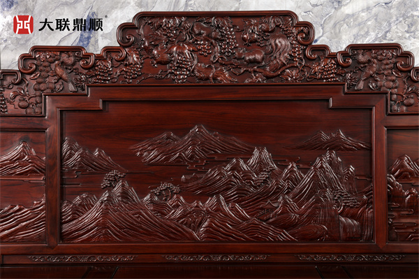 山水紋:在沙發(fā)、班臺(tái)上,鼎順紅木以精湛的雕刻技法,再現(xiàn)崇山峻嶺之境。構(gòu)圖講究深遠(yuǎn)、高遠(yuǎn)、平遠(yuǎn),咫尺之間蘊(yùn)含萬(wàn)里之勢(shì),營(yíng)造出超然物外、寄情林泉的文人雅趣,讓居室頓生山林清曠之逸氣。