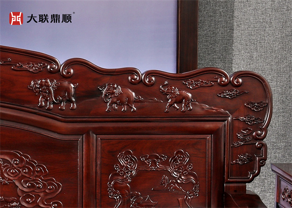 大象紋:大象體態(tài)敦厚,力大無(wú)比,象征吉祥、力量與穩(wěn)固?!跋蟆敝C音“祥”。鼎順紅木或?qū)⑵涓〉裼谏嘲l(fā),取其太平有象、吉祥如意的美好祝福。