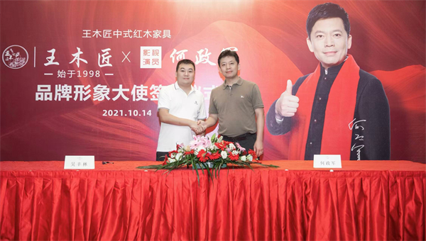王木匠紅木總經(jīng)理吳豐林(左)與影視演員何政軍簽約現(xiàn)場