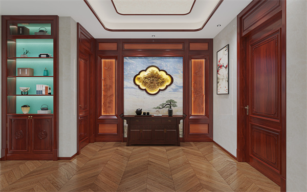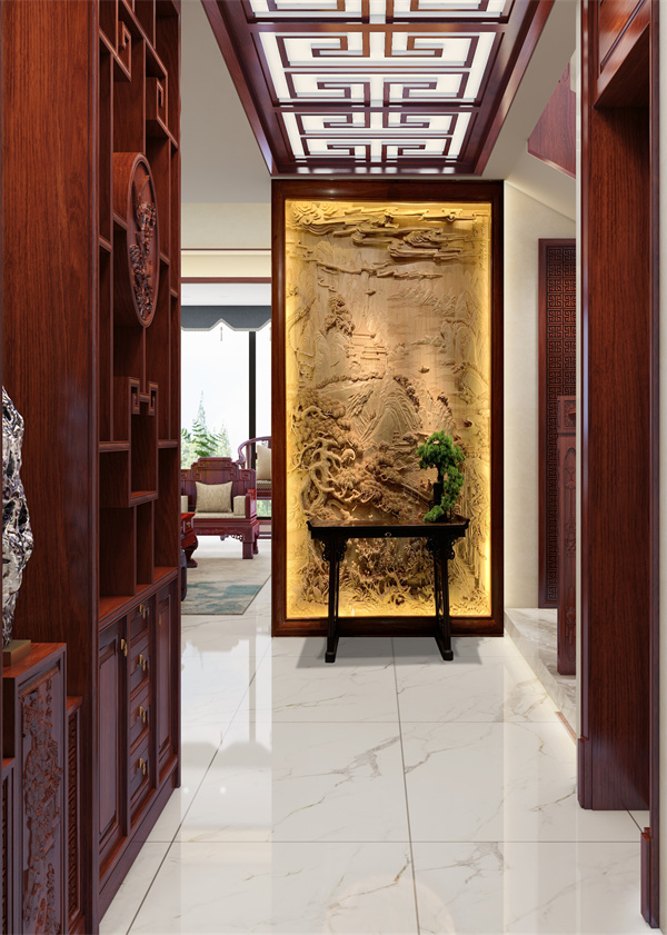 木雕點(diǎn)睛,寓意深遠(yuǎn):開(kāi)門即見(jiàn)一整幅氣勢(shì)恢宏的紅木雕刻,奠定藝術(shù)格調(diào)。下方搭配經(jīng)典條案,既實(shí)用置物,又巧妙平衡視覺(jué),避免喧賓奪主。
