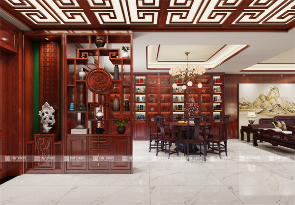 餐廳:象征團(tuán)圓的紅木圓桌,搭配兼具儲(chǔ)物與展示功能的隔廳柜、酒柜,實(shí)用與雅致兼得。