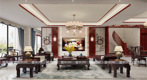 開(kāi)放式大平層的布局是現(xiàn)代生活方式的體現(xiàn),而內(nèi)部通過(guò)家具、木雕、隔斷等元素營(yíng)造的中式空間層次與意境,則是對(duì)傳統(tǒng)的致敬與升華,實(shí)現(xiàn)了傳統(tǒng)精神與現(xiàn)代形式的和諧統(tǒng)一。