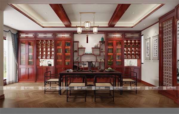茶室:整面墻定制組合柜(多寶閣+博古架)是收納與展示的智慧結(jié)晶。寬大茶臺(tái)配以官帽椅(主位尊貴)與禪椅(客位清雅),瞬間營(yíng)造出澄心靜慮的東方禪意空間,是品茗會(huì)友的絕佳場(chǎng)所。