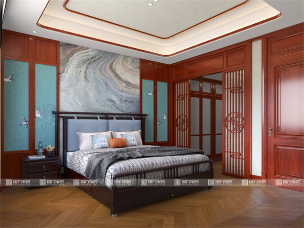 精工細(xì)作,細(xì)節(jié)見(jiàn)真章:如主臥古典大床,床頭階梯狀精雕細(xì)琢,寓意“步步高升”,將美好祝愿融入生活點(diǎn)滴,盡顯匠心巧思。