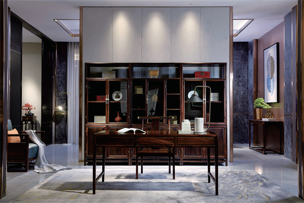 書房是心靈的棲息地,東林書院以簡約為筆,描繪當(dāng)代文人的雅致生活。明式平頭案線條流暢,寬大的案面留白,為思考預(yù)留自由空間;闊葉黃檀書柜沉穩(wěn)內(nèi)斂,收納萬卷詩書。
