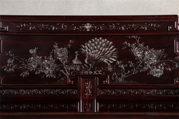 此前程似錦沙發(fā)通體滿雕,極富神韻。三人位沙發(fā)的背板檀雕孔雀牡丹圖。雍容牡丹盛放如錦、孔雀翎羽如云,此景深寓前程似錦、功業(yè)騰達之愿景。