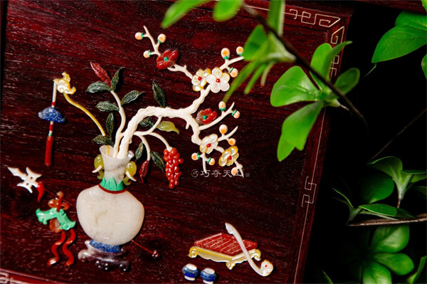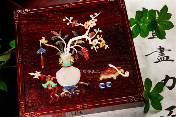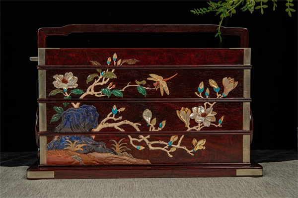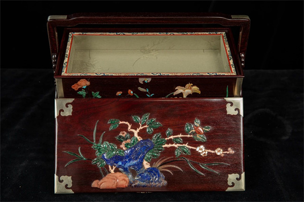 此首飾盒以小葉紫檀為材,顏色沉穩(wěn),做工細膩,盒面施以百寶嵌工藝,以各色玉石、瑪瑙、珊瑚、白貝等鑲嵌枝葉、果實,梅花點點綻放,畫面生動自然,增添收納趣味。