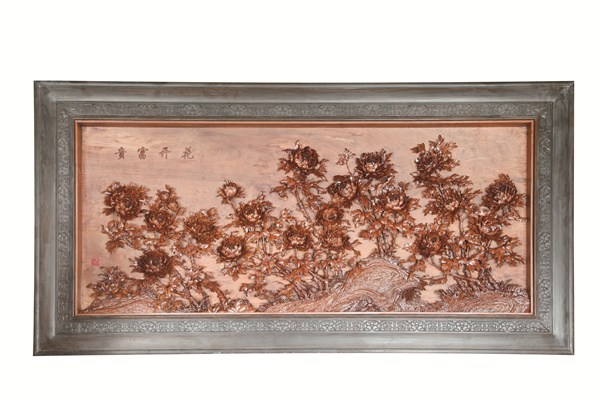 步入鴻庭軒的展廳,目光首先被一件名為《花開富貴》的木雕杰作攫住。此作出自鴻庭軒紅木創(chuàng)始人、工藝美術大師陳戴青之手,取緬甸花梨之溫潤,施以東陽木雕之鬼斧神工。刀鋒流轉處,朵朵牡丹如獲生命般次第盛放,花瓣層疊舒卷,雍容飽滿的姿態(tài)仿佛浸潤著大唐遺韻。牡丹作為“花中之王”,其富貴、祥瑞、華美的意象,在東陽木雕浮雕與鏤雕交織的細膩表達下,被賦予了超越視覺的祝福與向往——那是華夏千年對美滿生活的永恒祈愿,在木紋深處低語。