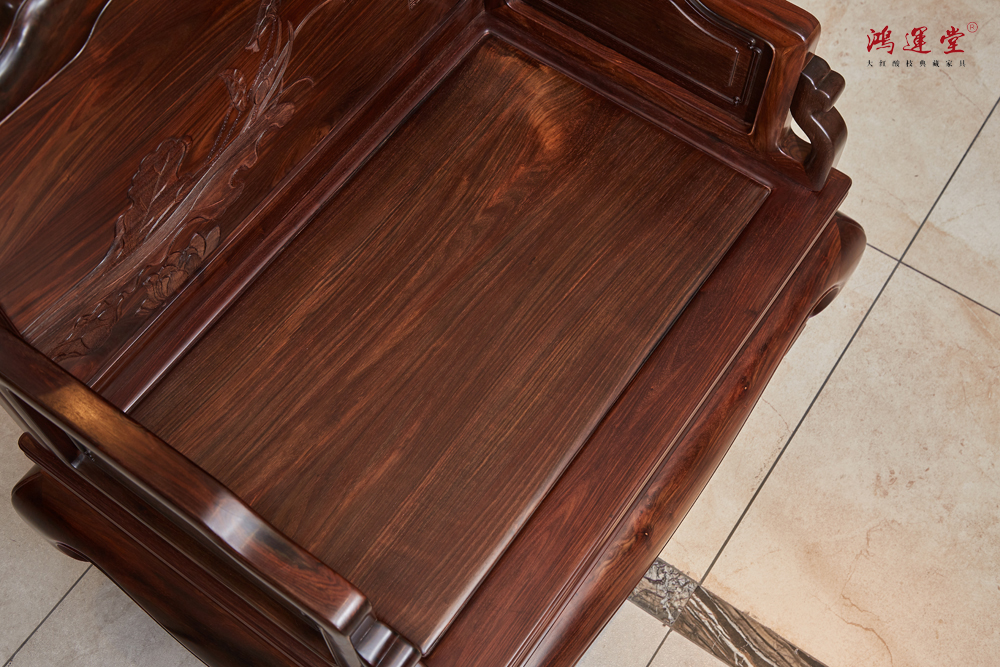 鴻運堂堅持健康環(huán)保理念,家具表面處理不上漆、不打蠟,僅以精細打磨和拋光呈現木材的天然質感,凸顯大紅酸枝的本真之美。