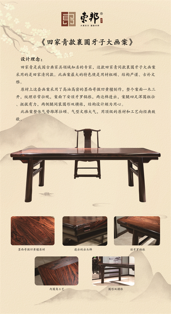 東邦紅木此次參展的三件作品,每一件都凝聚著對(duì)傳統(tǒng)工藝的深刻理解與精湛技藝。《田家青同款裹圓牙子大畫案》采用高油高密的墨西哥微凹黃檀打造,整個(gè)案面采用"一木三開"的頂級(jí)工藝,紋理展現(xiàn)出木材最原始的自然之美。畫案結(jié)構(gòu)嚴(yán)謹(jǐn)考究,案面下安頂牙羅鍋棖,兩側(cè)榫頭精心處理,四足渾圓粗壯卻又不失挺拔之姿。