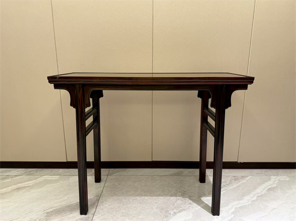 《大紅酸枝獨(dú)板平頭案》則完美詮釋了明式家具"大道至簡(jiǎn)"的設(shè)計(jì)理念。桌面采用整塊大紅酸枝獨(dú)板制作,紋理深邃流暢,展現(xiàn)出木材最本真的美感。案面下設(shè)多根厚料穿帶,保證了結(jié)構(gòu)的穩(wěn)固性。圓材腿足不施雕飾,僅以"四腿八挓"的經(jīng)典結(jié)構(gòu)就展現(xiàn)出沉穩(wěn)大氣的風(fēng)范,這正是明式家具"以簡(jiǎn)勝繁"設(shè)計(jì)哲學(xué)的最佳體現(xiàn)。