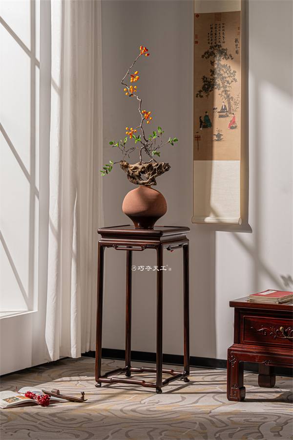 置于線條凝練的花幾之上,花幾婉轉的曲線如凝固的云氣,穩(wěn)穩(wěn)托起這方寸生機,自成畫卷。