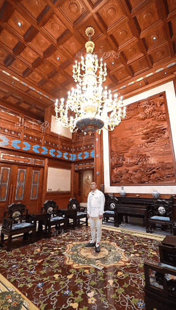 大師級緬甸花梨木雕屏風(fēng)以千里江山為卷軸,盡顯非凡造詣;穹頂棋盤格天花雕刻“福在眼前”紋樣,地面大理石同心結(jié)圖案寓意永結(jié)同心。