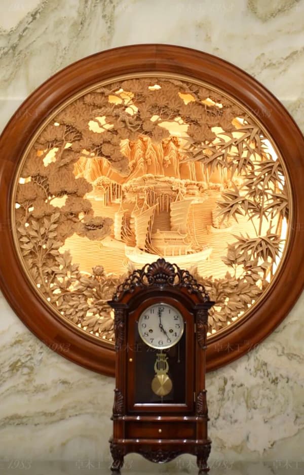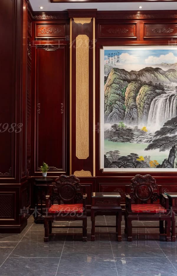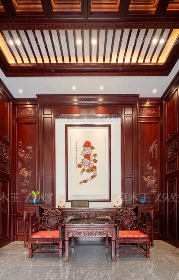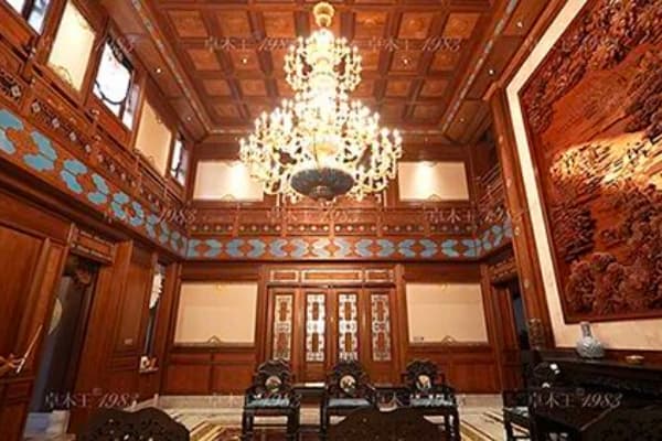 風(fēng)格特點(diǎn):中堂采用"屋中造屋"設(shè)計(jì),以榫卯結(jié)構(gòu)還原傳統(tǒng)形制;藻井斗拱以數(shù)千榫卯構(gòu)件精準(zhǔn)咬合,演繹“天圓地方”的宇宙觀;博古紋、云紋、螭龍紋等傳統(tǒng)紋樣處處藏典,傳遞家族信念;空間內(nèi)懸掛家傳書畫作品,木香墨韻相得益彰,凸顯文化世家的風(fēng)骨。