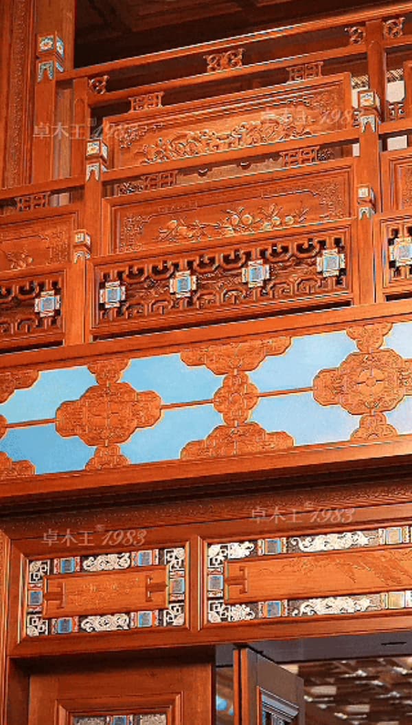 材質(zhì)選用:緬甸花梨+緬甸柚木(整裝),緬甸花梨(雕花板),搭配景泰藍(lán)、玉石、刺繡、大理石等裝飾。