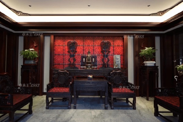 居中擺放的大紅酸枝老料八仙桌、供案、花架與太師椅,中軸對稱,雕刻海水、卷草等紋飾,寄托美好寓意。