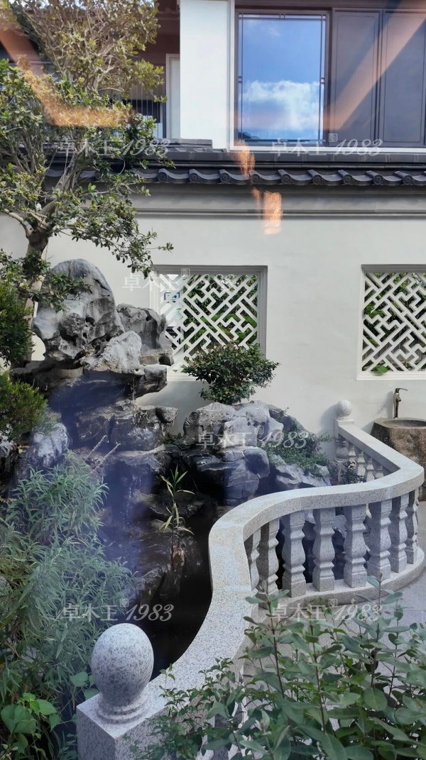 推門而入,粉墻黛瓦的江南園林躍入眼簾——萬字紋漏窗將天光剪成詩行,太湖石以“瘦、漏、透、皺”之姿立于庭中,疊山理水的魚池游弋著“年年有余”的吉愿,柿樹枝頭垂掛“事事如意”的碩果。一草一木,皆由主人親自構(gòu)思,人文與自然于此和諧共鳴。