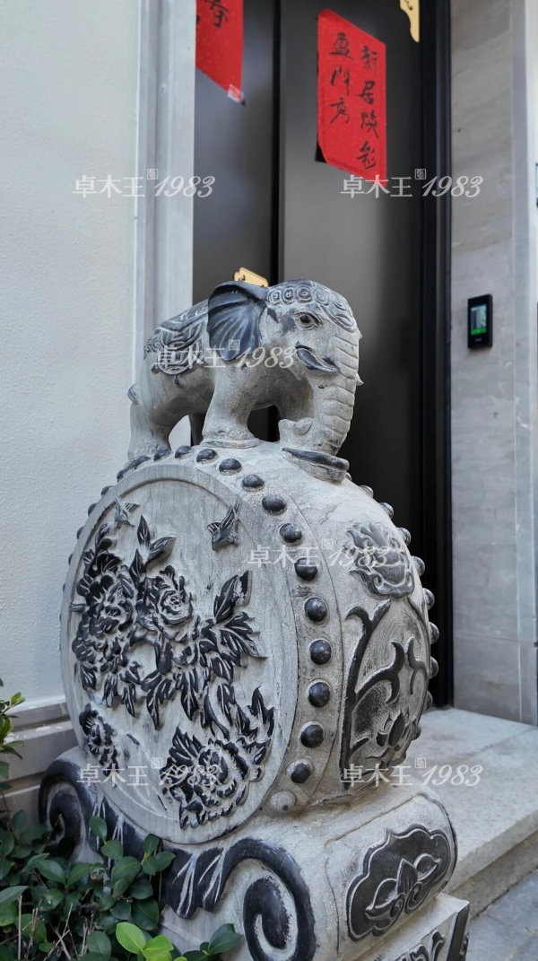 穿過綠意縈繞的花園小徑,一扇低調(diào)的隨墻門靜靜呈現(xiàn)。門當吉象鏟地浮雕牡丹紋,下承仰俯蓮瓣紋須彌座,細節(jié)處流露匠心。