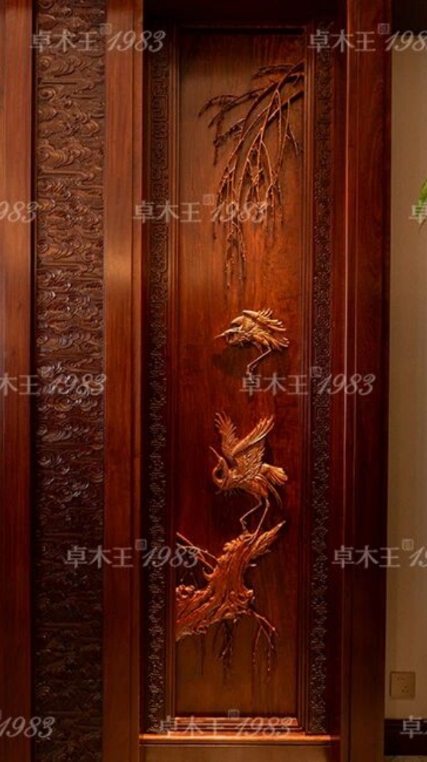紅木隔斷優(yōu)雅界定空間。中央多寶閣,珍藏著主人甄選的藝術(shù)瑰寶,無聲訴說著不凡的收藏眼光。兩側(cè)屏風,以精雕的四合如意云紋與銅錢紋為框,中央云紋開光處,鏟地浮雕的松鶴藤蘿圖栩栩如生,寓意吉祥高遠,為空間奠定尊榮底蘊。
