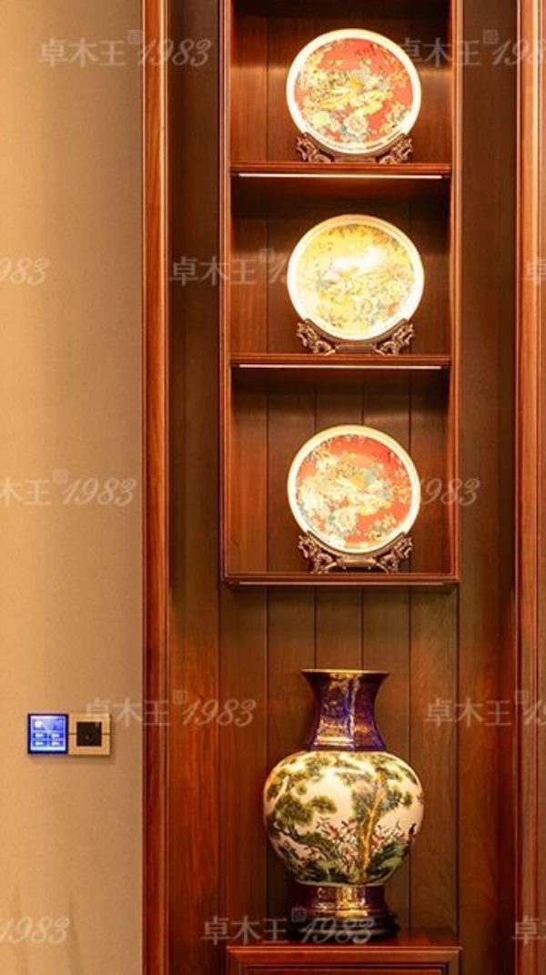 緬甸花梨多寶柜格內(nèi),陳列著主人經(jīng)年珍藏的藝術(shù)珍品。大紅酸枝老料復(fù)刻的故宮寶座,重現(xiàn)“內(nèi)庭恭造”的雅韻與威儀。