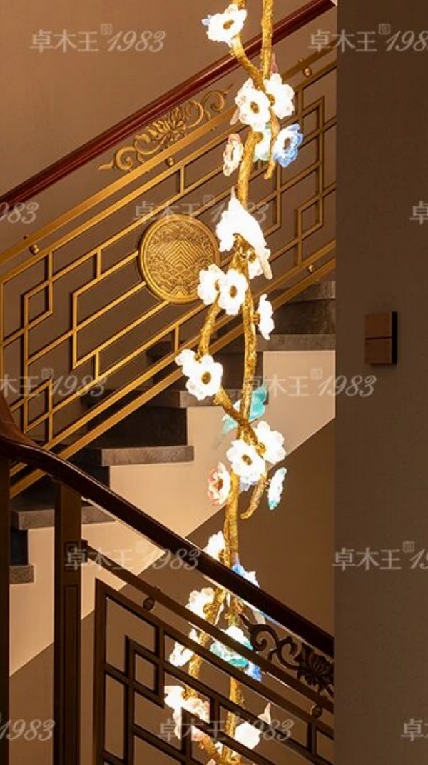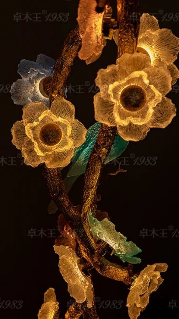 仰首可見9.6米高全銅鎏金琉璃藝術(shù)吊燈,鸚鵡花卉造型靈動璀璨,傾瀉一室華光。拾級而上,尊崇盡顯。
