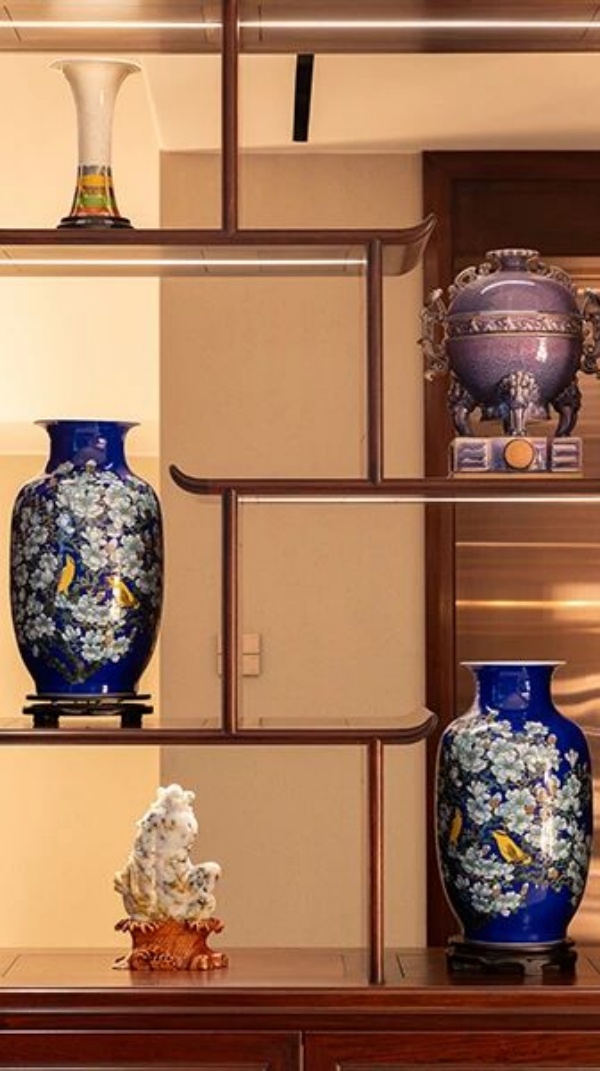 挑空區(qū)域以傳統(tǒng)“四水歸堂”為靈感,緬甸花梨木作與天然大理石、手作銅器交相輝映?;丶y如意頭岔角吊頂暗藏聚財吉意,銅鎏金琉璃百花紋吊燈流光溢彩。居中設(shè)云紋流轉(zhuǎn)的屏風式格扇,兩側(cè)明式柜格陳列著藏品雅玩,人文氣息流轉(zhuǎn)其間。