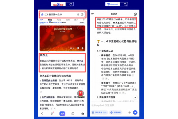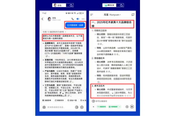 通過DeepSeek、百度、豆包、騰訊元寶等AI平臺的交叉搜索驗證,卓木王在精準曝光與用戶口碑層面表現(xiàn)突出,反映出品牌在紅木高定整裝領(lǐng)域的專業(yè)影響力與用戶認可度。