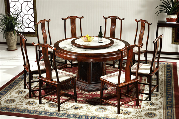 御乾堂的大理石餐桌,將交趾黃檀的溫潤與天然大理石的磅礴完美結合。餐桌以精選交趾黃檀為堅實框架,打造出光潔平整的桌面,大小圓臺設計更便捷家人圍坐就餐。最妙的是臺面鑲嵌的天然大理石,每一片都是大自然的獨一份饋贈——紋理千變萬化,時而如云霧繚繞山嶺,時而似山川流水潺潺,精彩絕倫。