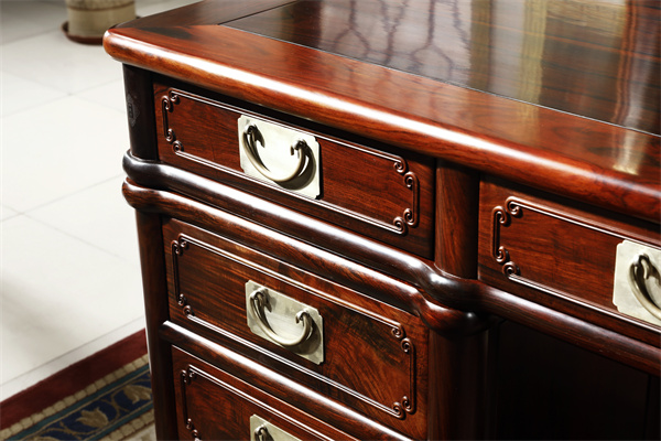 寬敞的桌面配以多個布局合理、空間充足的抽屜,讓學習工作更加井然有序。細節(jié)之處尤見真章——抽屜拉手等銅件設計精致典雅,既實用又美觀。當這款書桌與配套書柜巧妙搭配,整個書房空間煥發(fā)出渾然一體的和諧美感,共同營造出一種超越單件物品本身的美妙氛圍。
