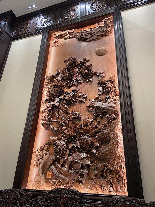 背景墻:木雕畫卷,寓意深遠(yuǎn)