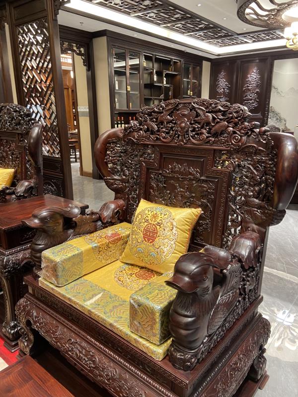 客廳中央陳列著一套大型清式寶座沙發(fā),用料厚重,結(jié)構(gòu)穩(wěn)固。沙發(fā)通體雕刻山水、松鶴圖案,寓意福壽綿長與志向高遠(yuǎn);扶手處精心雕琢鴛鴦,象征家庭和睦與情誼深厚。其精湛的雕工與沉穩(wěn)的造型,成為整個(gè)空間的視覺焦點(diǎn),彰顯出鴻庭軒紅木對(duì)傳統(tǒng)工藝的堅(jiān)持與創(chuàng)新。