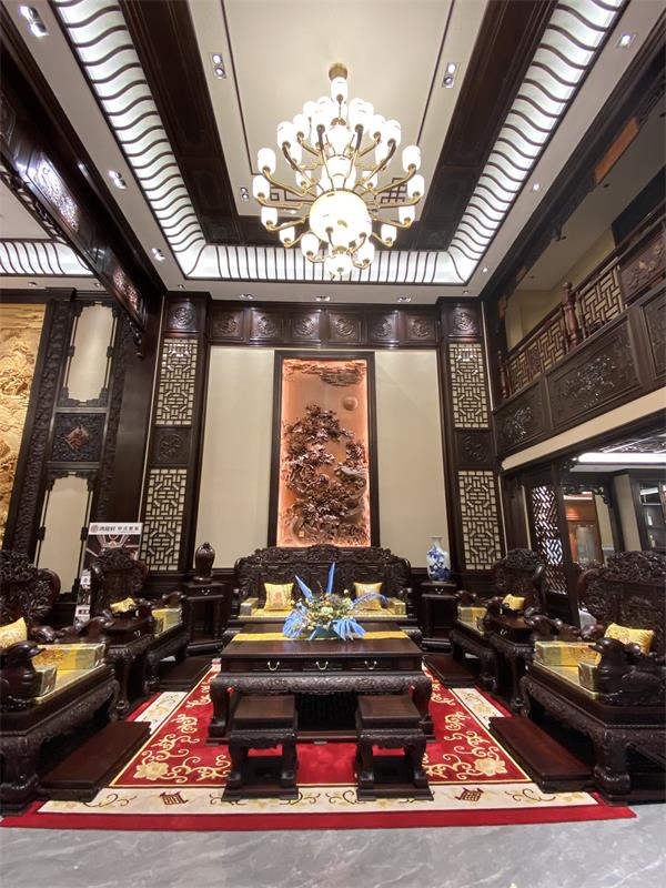 在一處大平層客廳的設(shè)計(jì)中,鴻庭軒紅木以精湛的工藝與獨(dú)特的美學(xué)視角,打造出一個(gè)恢弘大氣的紅木整裝空間。
