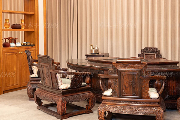風(fēng)格特點(diǎn):萃取中國古典美學(xué)的精髓,精選高端紅木材質(zhì),融東陽木雕、古典繪畫于一體,以精湛雕刻見意境,以木韻襯茶香,營造當(dāng)代世家大族的精神棲居地。