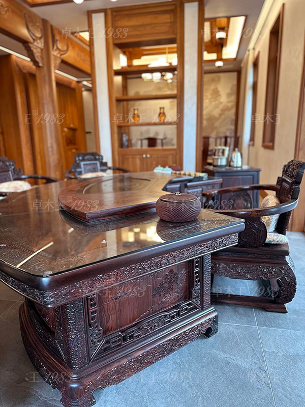 材質(zhì)選用:大紅酸枝茶臺(tái)×緬甸柚木多寶閣