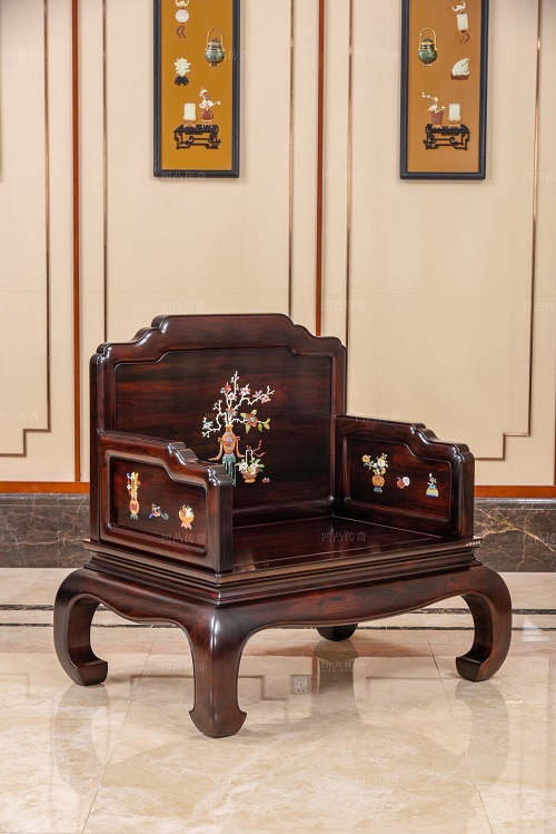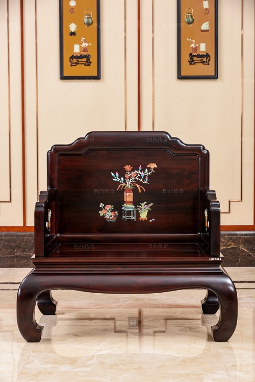 單人位座椅側(cè)板鑲嵌清供博古圖,每一處細(xì)節(jié)都暗含“清供雅玩”的文化密碼,讓坐具成為可觸摸的立體畫(huà)卷,既有雅致生活的寓意,也透露著文化的傳承。