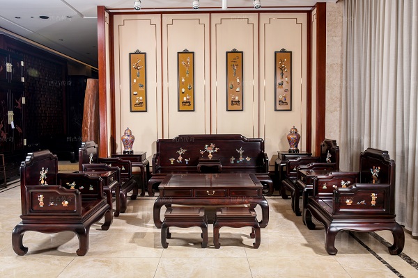 《喜事連連沙發(fā)》每個(gè)座椅靠背鑲嵌的百寶都是精心設(shè)計(jì)過(guò)的,翡翠、瑪瑙、南紅、和田玉、跟紅木鑲嵌在一起,層次感很豐富,在紅木的映襯下,寶石顯得更亮眼。