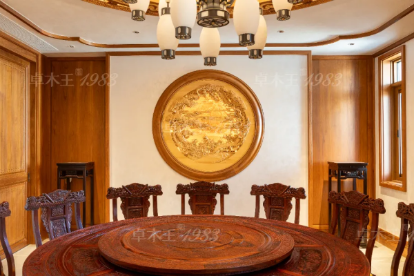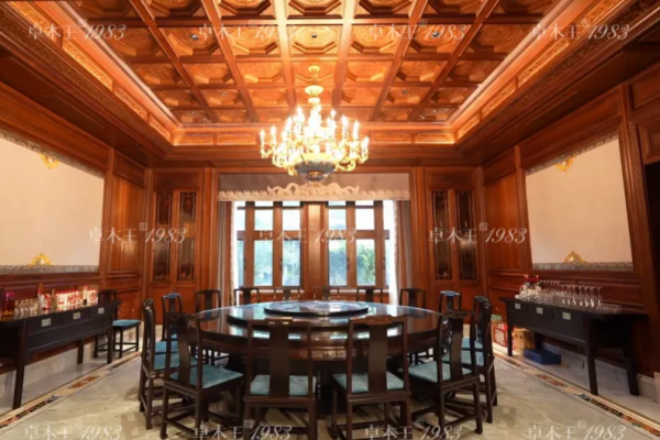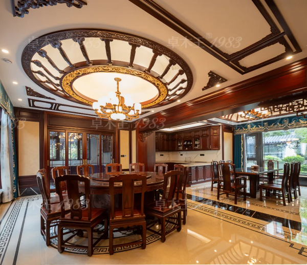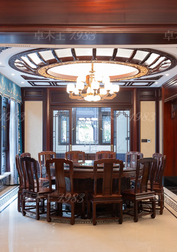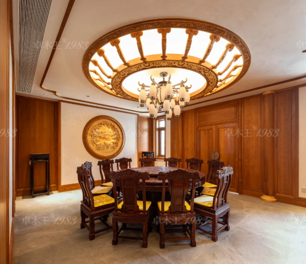 在紅木整裝的傳世大宅中,餐廳早已超越尋常的食事空間,成為家族禮序的載體、待客之儀的舞臺,東方美學的靜默表達。卓木王作為紅木整裝領域的匠心傳承者,深諳如何將東方美學的深厚底蘊,融入當代大宅的生活肌理,以木為語、以藝為境,勾勒出兼具文化厚度與時代氣韻的宴居圖景。