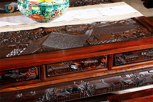 此桌形制規(guī)范嚴(yán)謹(jǐn),由兩個(gè)架墩支撐,氣勢(shì)恢宏。其正面及兩側(cè),均以精湛刀工雕刻古代生活場(chǎng)景,樹(shù)木、百姓、店家、河流、船只、遠(yuǎn)山……雕琢工整精細(xì),一絲不茍,任何一面都是一幅獨(dú)立的畫(huà)作。