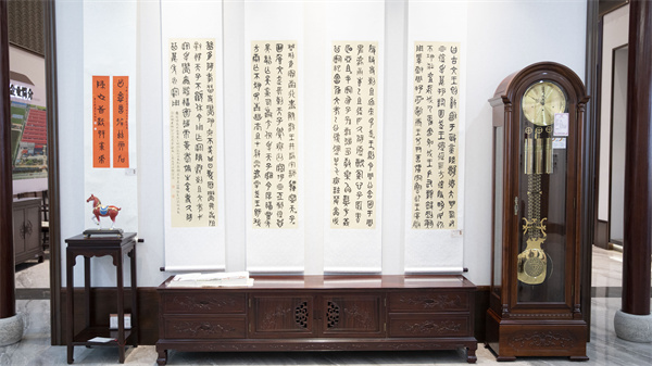于建華師生們的書法作品,或懸掛于素壁,或靜置于紅木案幾之上。筆走龍蛇的意氣與巧奪天工紅木精品的溫潤厚重,在此刻達成了完美的默契。