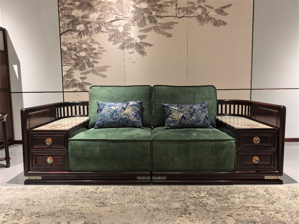 錦繡沙發(fā)——寬敞平穩(wěn)的座位設(shè)計(jì)體現(xiàn)著東方家居的端莊大氣。創(chuàng)新的扶手設(shè)計(jì)成為可置物的平臺(tái),并巧妙設(shè)置兩個(gè)抽屜,極大提升了實(shí)用性。平臺(tái)鑲嵌的亞馬遜綠奢石與整套沙發(fā)的綠色軟搭相互呼應(yīng),展現(xiàn)著設(shè)計(jì)的整體性與協(xié)調(diào)性。