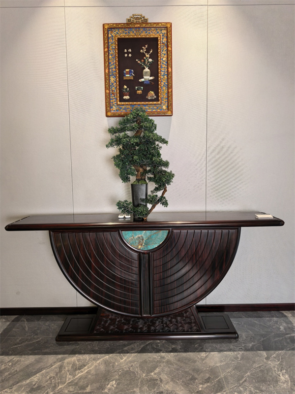 錦繡玄關(guān)柜——以半圓的特別形態(tài)打破傳統(tǒng),亞馬遜綠奢石鑲嵌于柜身中心,在玄關(guān)處便牢牢吸引入戶者的目光。這一設(shè)計(jì)既保持了東方美學(xué)的含蓄,又融入了現(xiàn)代藝術(shù)的大膽創(chuàng)新,成為空間中的點(diǎn)睛之筆。