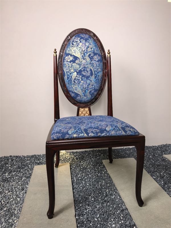 錦繡餐椅——采用高貴典雅的三彎腿設(shè)計(jì),融入了法式家具的浪漫風(fēng)格。橢圓形的靠背搭配藍(lán)色精美花紋布料,在保持新中式韻味的同時(shí),注入了國際化的審美元素。
