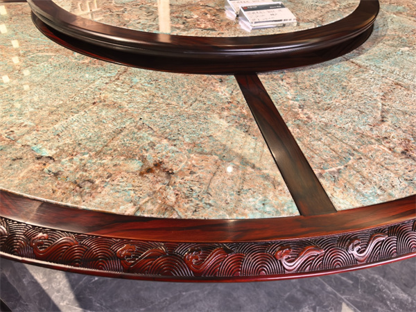 錦繡圓臺(tái)——桌面巧妙地將條紋烏木與亞馬遜綠奢石相嵌合,配以精致的小圓臺(tái)設(shè)計(jì)。圓桌牙板雕刻著細(xì)膩的浪花紋,下方圓柱形支撐體上點(diǎn)綴著琺瑯彩裝飾,在傳統(tǒng)與現(xiàn)代之間找到了完美的平衡點(diǎn)。